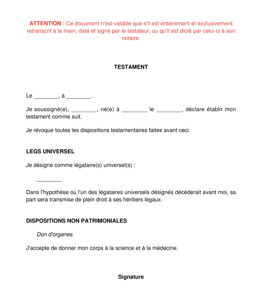 Un testament permet à une personne, appelée le testateur, d'exprimer ses dernières volontés concernant la répartition de ses biens après son décès. Le testament permet de déterminer qui seront les héritiers et ce qu'ils hériteront.