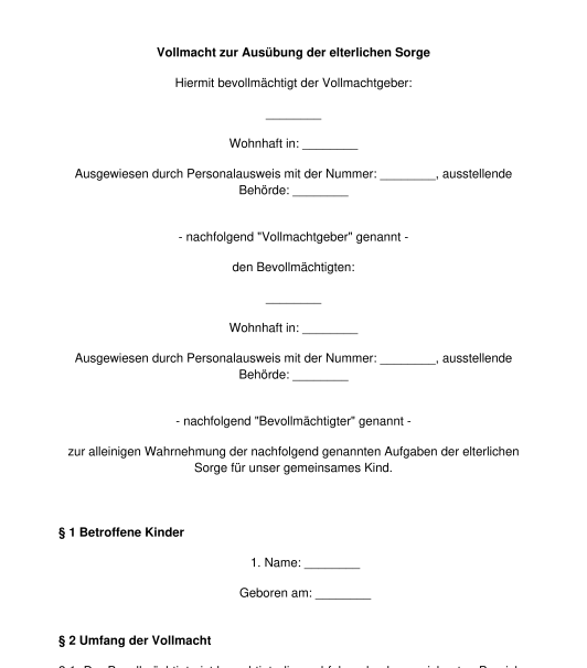Vollmacht zur Ausübung der elterlichen Sorge - Muster