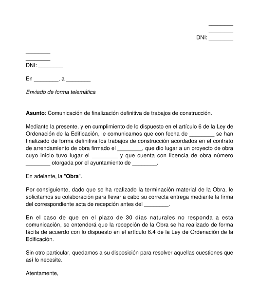 Rellenar el modeloEste documento permite que un constructor comunique al promotor de una obra nueva, o a los clientes de obras o reformas de gran entidad (es decir, de obras sobre elementos estructurales de un inmueble), la finalización de la obra o construcción. Tras esta comunicación, las partes podrán acordar la firma de un acta de recepción de obra.