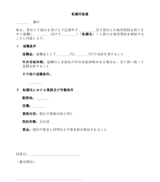 • 同意文言:この書面に記載された退職条件と入社条件で、転籍に同意する旨の文言を記載する必要があります。