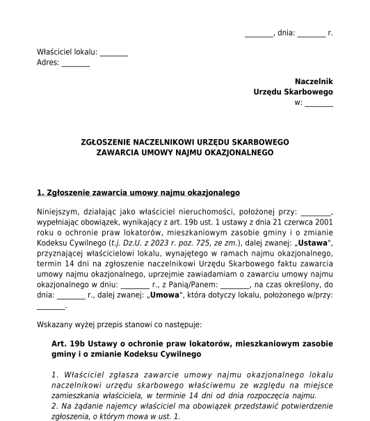 Aby zgłoszenie umowy najmu okazjonalnego do urzędu skarbowego było skuteczne należy sporządzić następujące dokumenty: